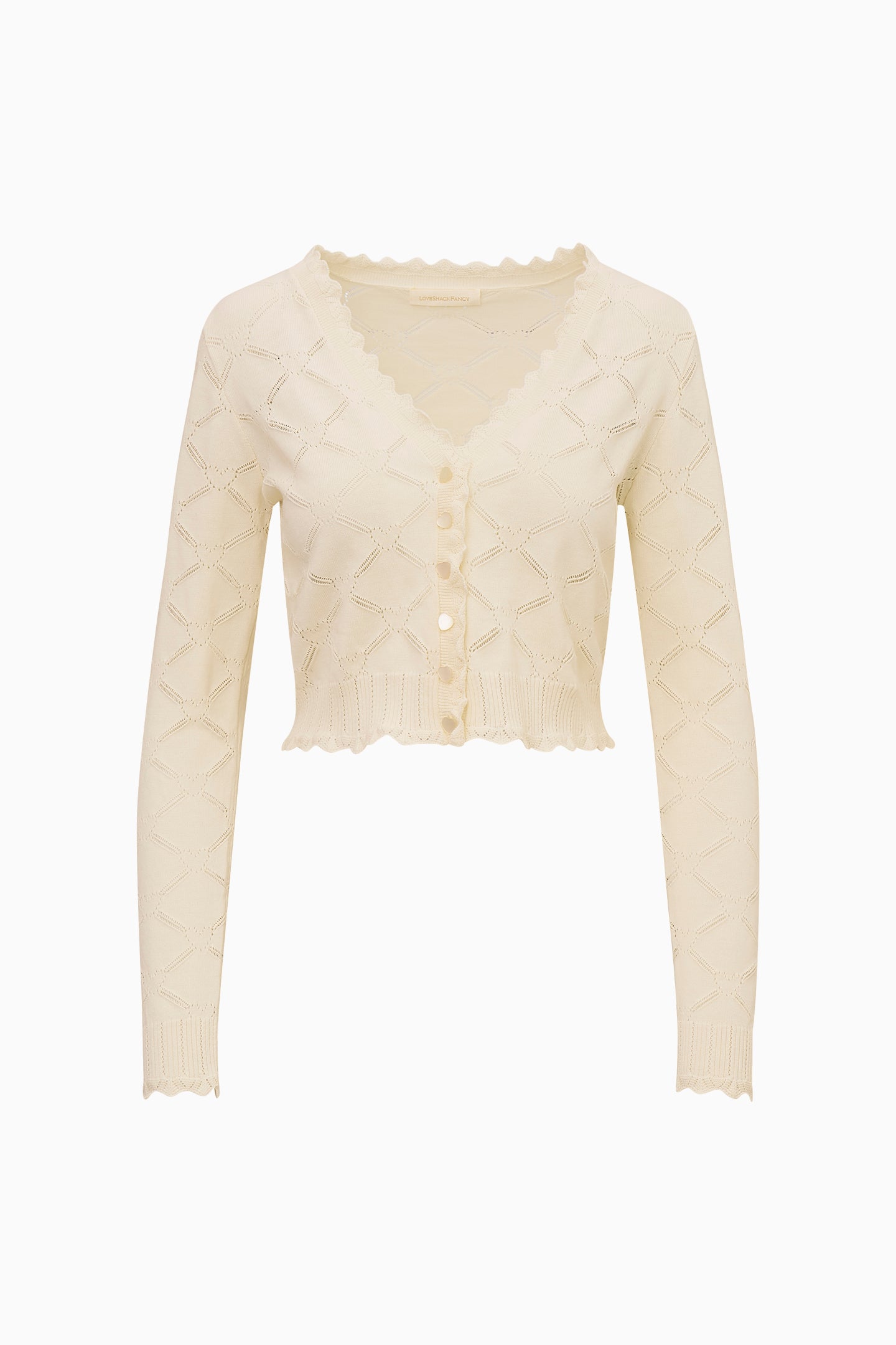 Cozy chic in the Petra Cardigan. Featuring a rib pointelle fabric, this knit is reimagined with our sweetheart argyle pattern with a pointelle detail, a v-neckline, our custom LoveShackFancy faux shell heart-shaped buttons, and pointelle scallop trims at the hem and the cuffs.