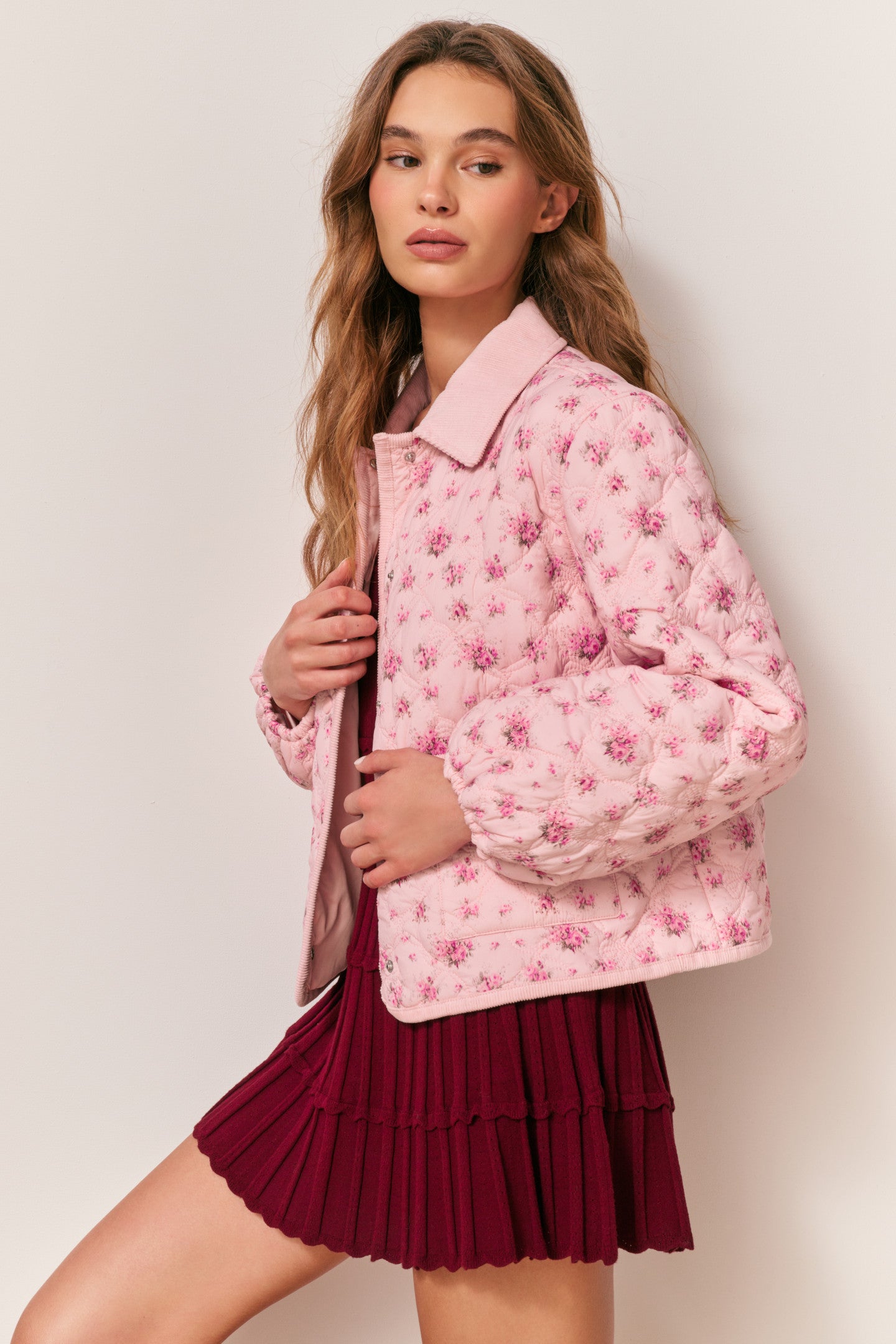 The Quinlette Jacket brings cozy charm to your outerwear rotation with a nod to classic New England style. Crafted in printed Nordic nylon and quilted in a delicate lattice-bow pattern, this medium-weight puffer channels the spirit of vintage hunting jackets with a romantic twist. Slightly boxy and hitting at the hip, it features a corduroy collar, cinched elastic sleeves, and practical waist pockets for warmth and ease. Perfect for crisp fall days, Quinlette blends effortless utility with whimsical LoveShackFancy detailing.